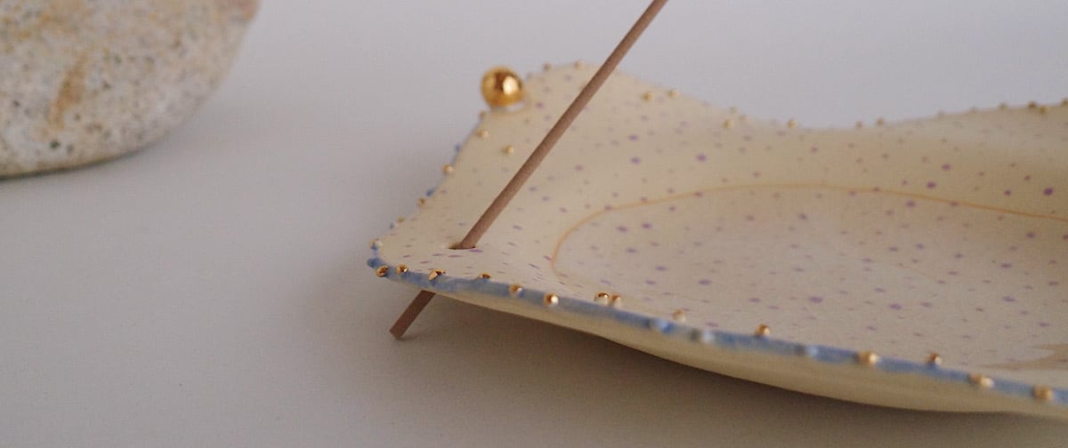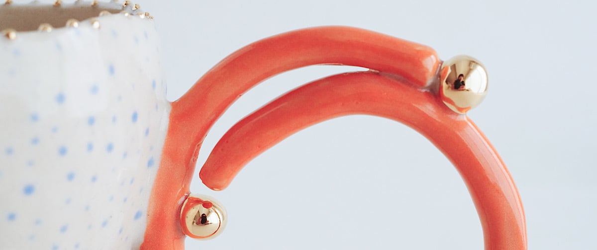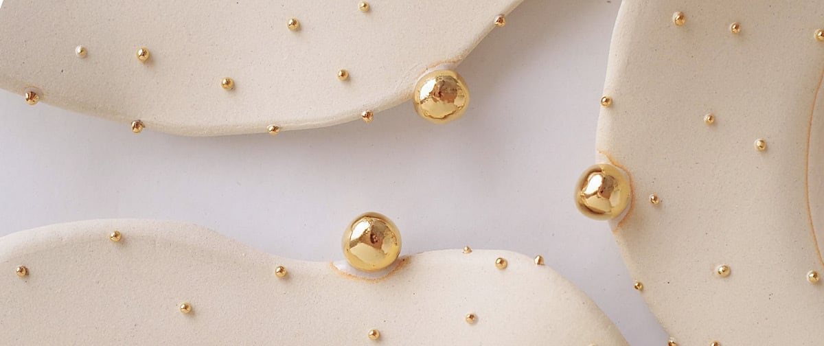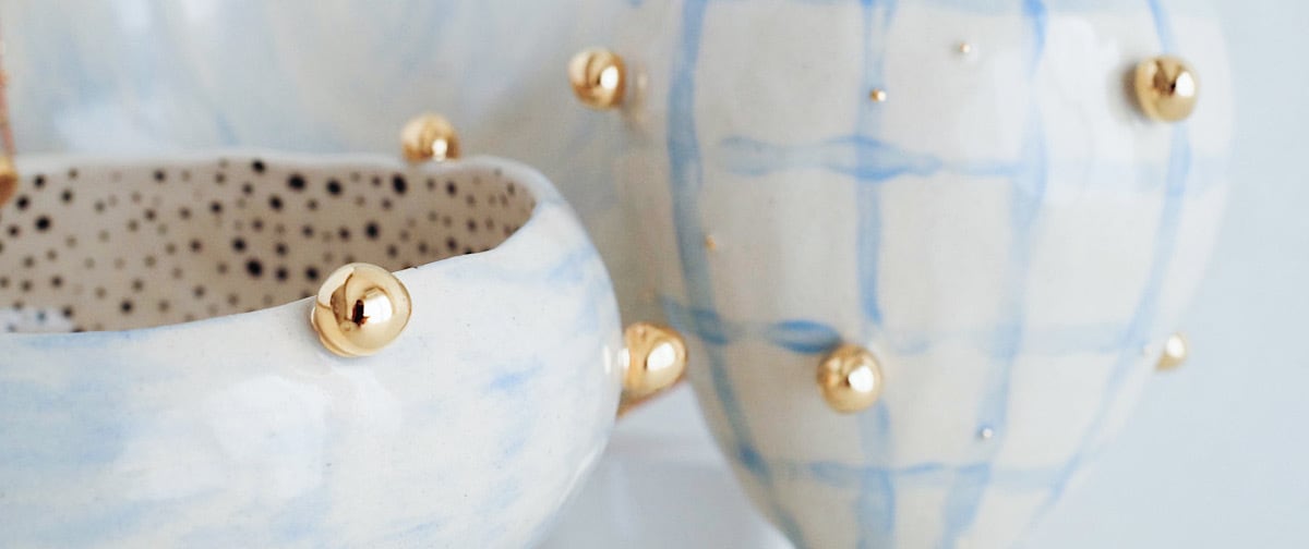 淡いブルーのボディに ゴールドのモチーフを配した有機的なオブジェ。 内側のブラックドットとのコントラストが特徴的です。 そのままオブジェとして飾っていただく他に フルーツやお菓子を盛ってキッチンに飾っておくのもおすすめ♡ -------- particle. の作品は 一点ずつ手びねりという方法で制作しています。 土のかたまりから手で形作り 手あとの感じる仕上がりや 自然に生まれる個体差を大切にするため 機械的に整えることはせず、 歪みもふくめた佇まいに 愛嬌を感じる作品を目指しました。 【素材】 陶土、金(絵付け部分) 【サイズ】 横幅: 約8.0cm 高さ: 約11.5cm (最大値計測)